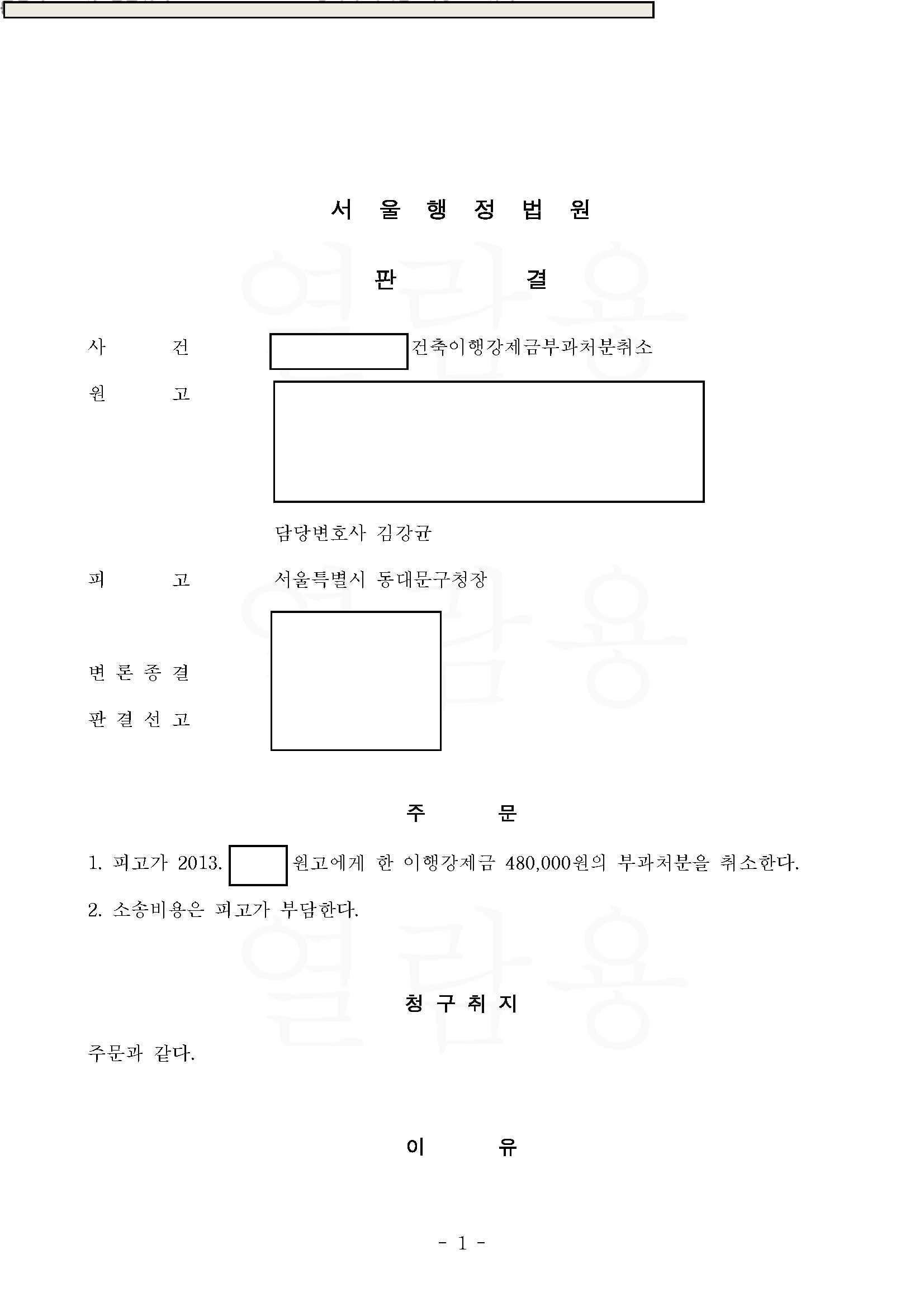 서울행정법원은, 2층 증축부분은 A의 소유가 아니므로 00구청의 이행강제금부과는 위법하다고 하면서 이행강제금 부과처분을 취소하였습니다.