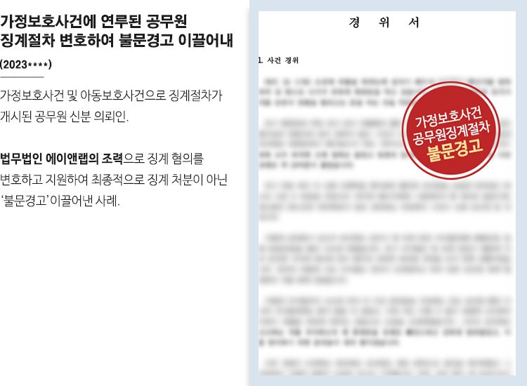 의뢰인은 지방 G시 공무원으로, 가정보호사건 및 아동보호사건이 문제되어 재직기관에 통보가 되었고 이에 징계절차가 개시되었습니다. 징계처분만은 피해야만 했던 의뢰인은 저희 법무법인 에이앤랩에 조력을 요청하였습니다.