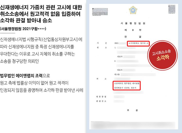 의뢰인(피고)은 신재생에너지법에 관한 행정과 입법을 관장, 운영하는 중앙행정기관인 선업통상부로 고시처분취소 청구의 소를 당하였는데요. 원고 측은 신재생에너지법 시행규칙(산업통상자원부고시)에서 여러 신재생에너지원 중 특정 신재생에너지를 우대한다는 이유로 고시 자체의 취소를 주장하였습니다.