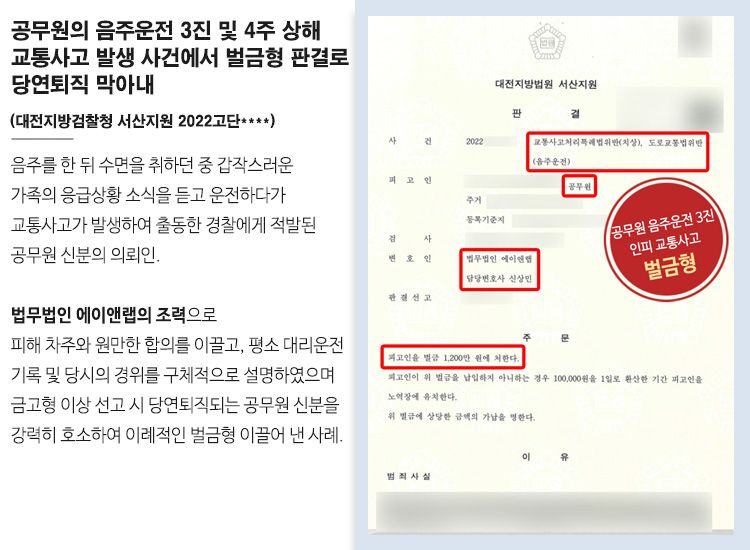 이에 금고 이상 형 선고 시 공무원 당연퇴직을 해야 한다는 사실에 두려움에 쌓인 의뢰인은 신속하게 법무법인 에이앤랩을 찾아 도움을 요청해오셨습니다.