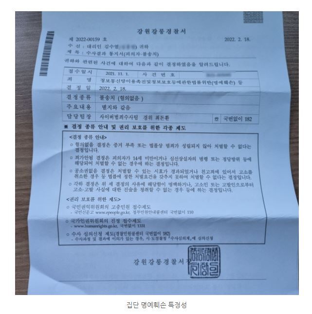 그 결과, 경찰에서 명예훼손, 모욕 혐의에 대해 모두 불송치(무혐의)로 조기 종결할 수 있었습니다. 불송치 통지서를 보니 역시 저희 주장대로 집단 표시에 의해서는 특정성이 인정되지 않는 것이 주된 사유였습니다.