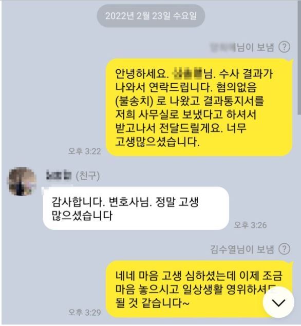 지방에서 수임하신 건이라 경찰조사를 위해 지방까지 가서 의뢰인분 아버님까지 뵈었던 지라 너무 잘 해결되어서 개인적으로 저도 기쁘고 뿌듯했던 건으로 기억됩니다.