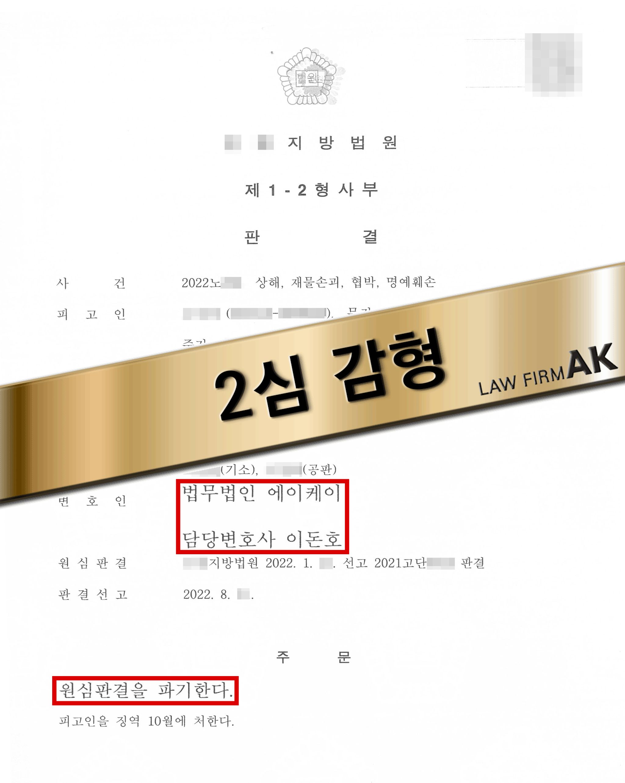 의뢰인은 직장동료인 피해자(유부녀)와 성관계를 빌미로 협박 및 명예훼손을 하였으며, 대화 과정에서 피해자에게 상해 및 재물손괴를 한 혐의로 징역 1년을 선고받았습니다. 그러나 의뢰인은 해당 양형이 너무 무겁다고 생각하였으며 법무법인 AK는 2심에서 피고인의 감형을 위해 변론을 맡게 되었습니다.