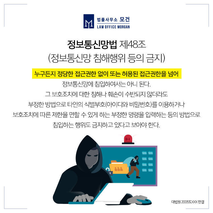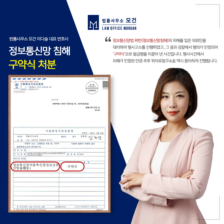 법률사무소 모건의 이다슬 대표 변호사는 대한변호사협회등록 형사전문변호사로서, 최근 정보통신망침해의 피해를 입은 피해자를 대리한 고소를 진행하여 '구약식'의 처분을 이끌어낸바 있습니다. 관련 사건에 도움이 필요하신 분들은 법률사무소 모건으로 문의하시기 바랍니다.