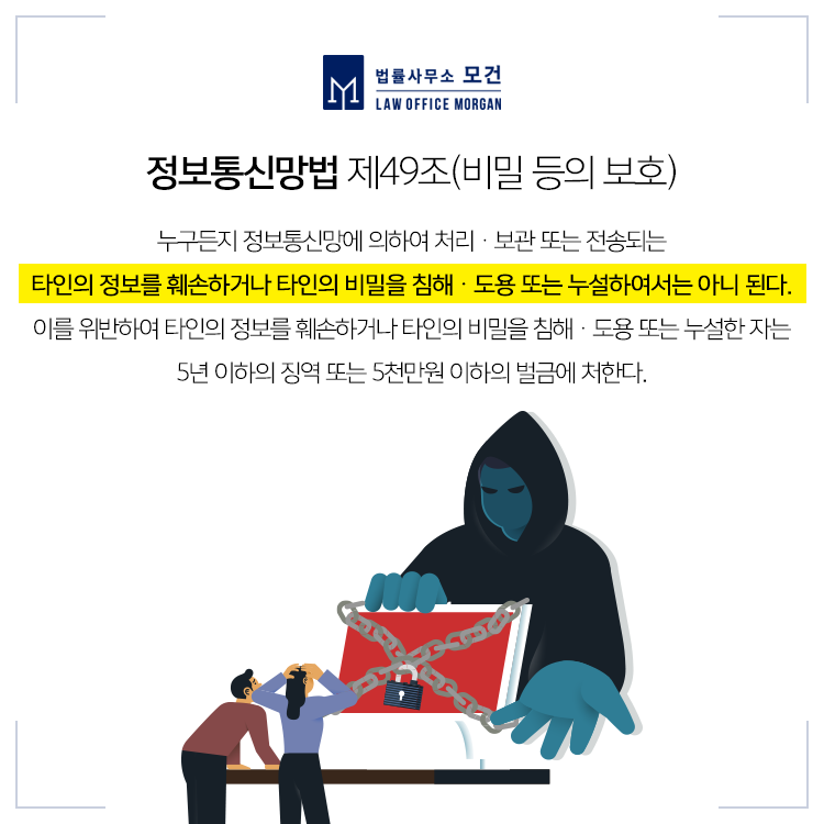 ✔ 관련법 정보통신망법 제71조 제9호와 제11호에 따라 '정보통신망에 침입한 자', '타인의 정보를 훼손하거나 타인의 비밀을 침해ㆍ도용 또는 누설한 자'는 5년 이하의 징역 또는 5천만원 이하의 벌금으로 처벌됩니다.