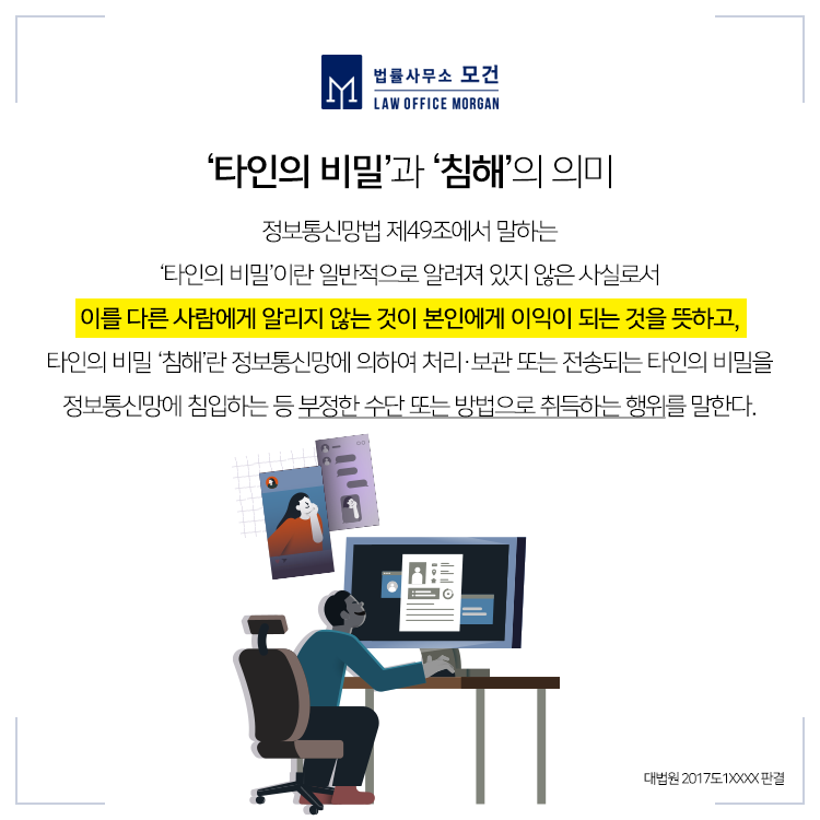 예를들어 본인에게 허용권한이 없음에도 타인의 잠금된 PC나 노트북, 이메일이나 SNS, 카카오톡 등에 접속하고, 이에 대한 비밀을 침해하거나 누설하는 경우, 정보를 삭제하는 등의 행위를 한 경우에는 정보통신망법위반에 따라 형사처벌의 대상이 될 수 있습니다. 해당 범죄는 타인의 프라이버시를 침해하고, 추가적인 피해가 발생할 수 있는 범죄라 보기 때문에 매우 엄중하게 처벌되고 있습니다.