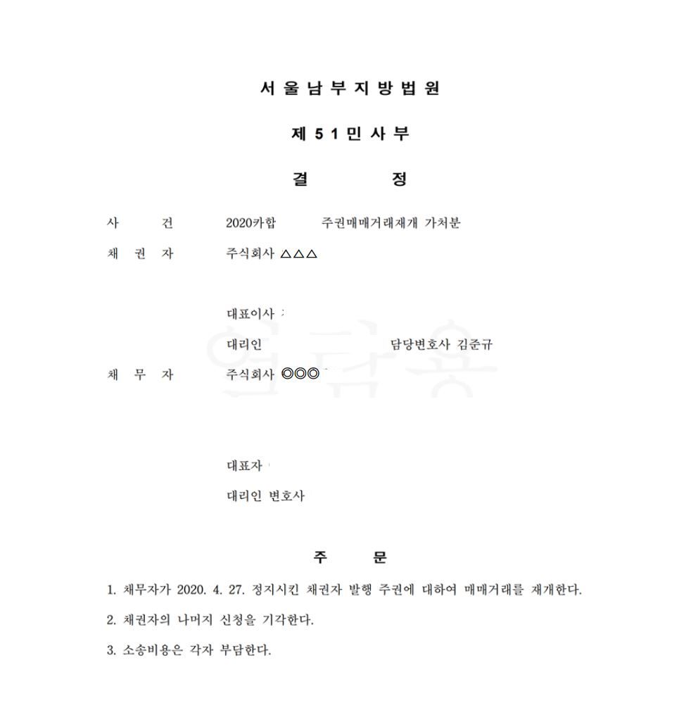 법원은 변호사의 주장을 받아들여 ▲▲▲ 사에 대한 주권거래정지조치를 해제하는 취지의 결정을 하였습니다. 또한, 한국거래소가 실질을 따지지 아니하고 기계적으로 주권거래정지조치를 하는 것에 대하여 무효일 수 있다고도 판단하였습니다.