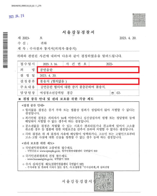 이러한 저의 조력을 바탕으로 A씨는 '불송치(혐의없음)' 결정을 받음으로써 '바바리맨'이 될 뻔한 억울한 상황에서 벗어날 수 있었습니다.