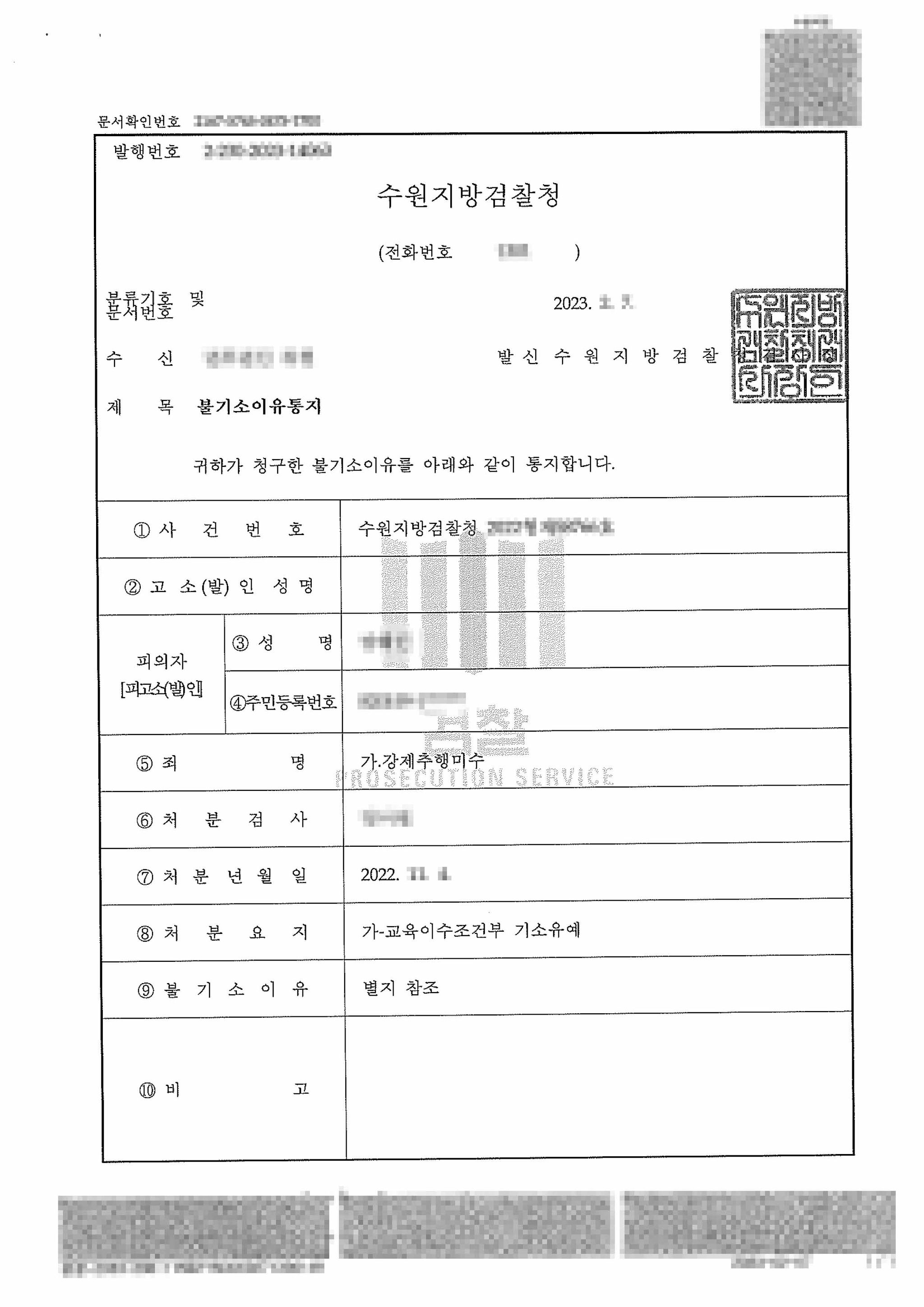 검찰은 의뢰인이 초범이라는 점, 피해자가 처벌을 원하지 않고 있다는 점, 의뢰인이 성폭력 프로그램 교육이수를 서약하고 있다는 점 등을 참작하여 의뢰인에게 성폭력 프로그램 교육이수 조건부로 기소유예 처분을 하였습니다.