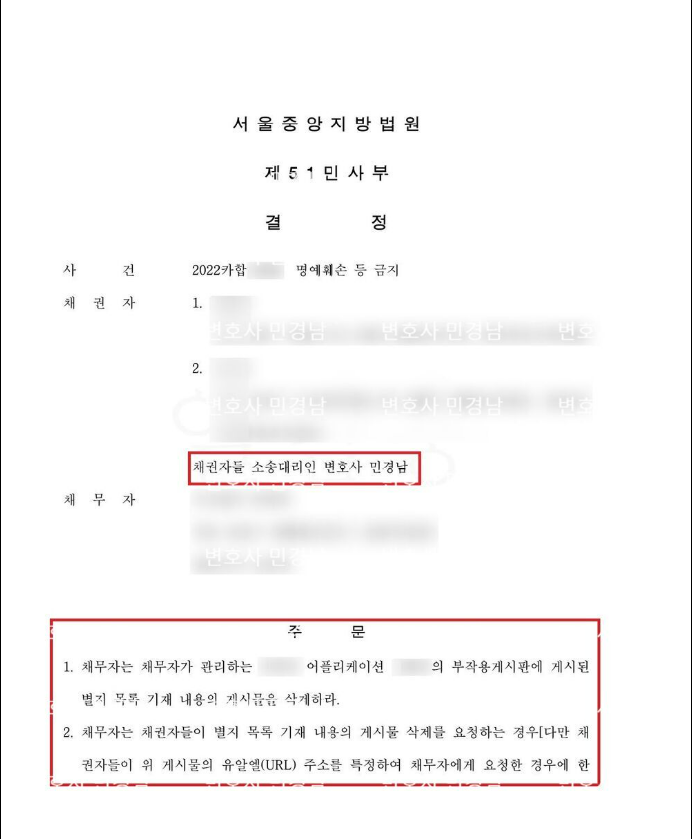 따라서, 어플에 작성된 댓글 내용이 허위 사실 적시에 의한 명예훼손이라는 전제로 댓글을 삭제하고, 위와 같은 댓글이 다시 올라올 경우 삭제를 요청하면 3시간 이내에 삭제할 것, 이를 위반할 경우 1시간 당 20만원을 지급하라는 게시금지가처분(명예훼손금지 가처분)을 신청하게 되었습니다.