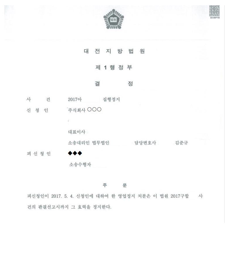 법원은 변호사의 주장을 받아들여 우선 영업정지 집행정지 처분을 하였고, 위 사건은 결론적으로 조정을 통하여 영업정지의 기간을 단축하는 것으로 종결되었습니다.