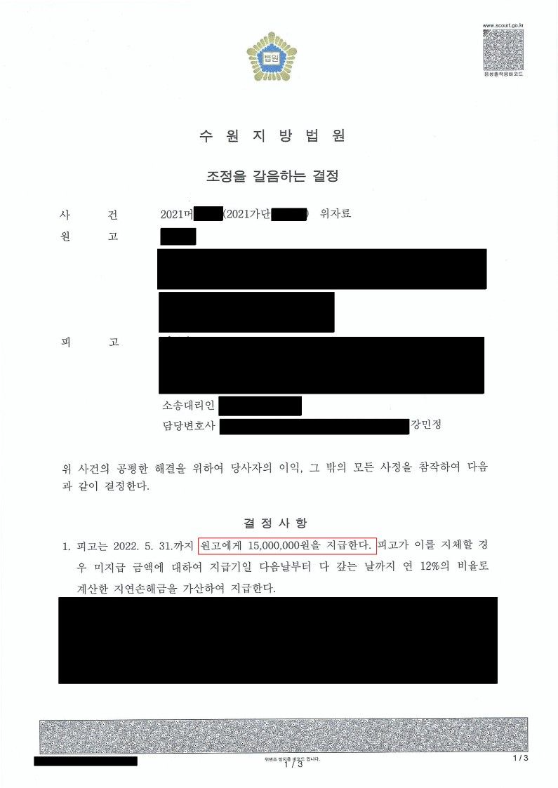 상대방이 청구한 4천만원에서 2천 5백만원이 감액된 1천5백만원으로 조정결정을 받아낼 수 있었습니다.