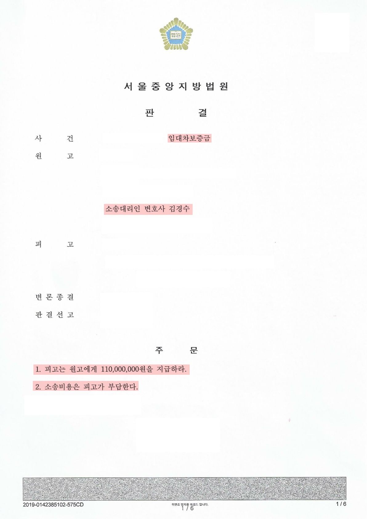 임차보증금과 소송비용 전액까지 받아 승소를 한 사례도 전해드리겠습니다.