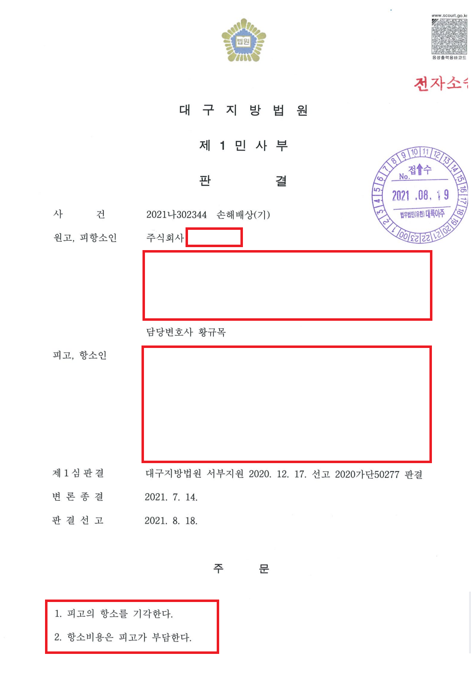결국, 원고 회사는 1, 2심 전부 승소하여, 피고로부터 청구금액 전액과 이자 상당의 금원을 변제받을 수 있었습니다.
