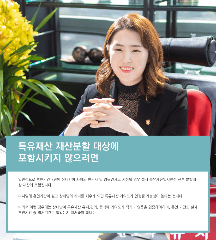 다시말해 혼인기간이 길고 상대방이 자녀를 키우게 되면 특유재산 기여도가 인정될 가능성이 높다는 겁니다.