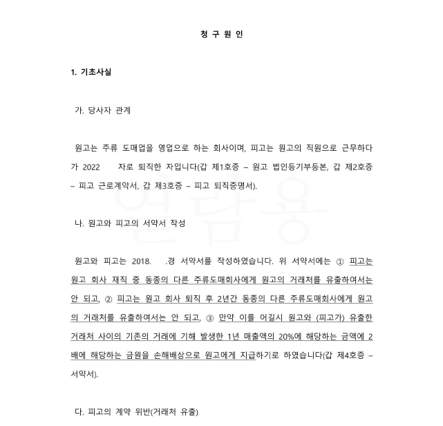 의뢰인은 회사로서 재직 근로자들로부터 경업금지의무 및 위약금에 관한 서약서를 받아놓았는데, 근로자인 피고가 퇴직하면서 위 서약에 반하여 의뢰인의 거래처를 유출하여 즉시 저를 찾아오셨습니다.