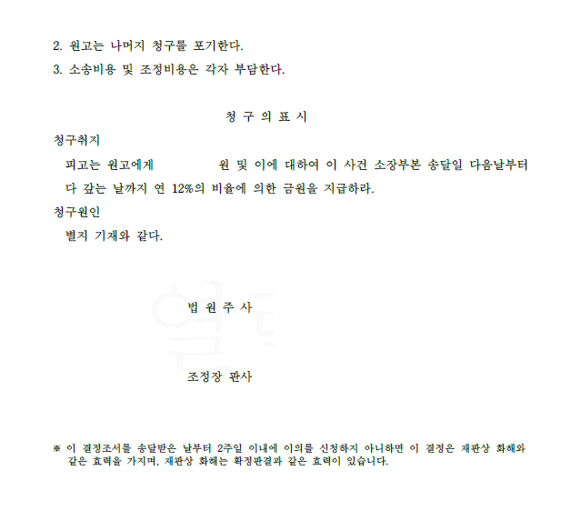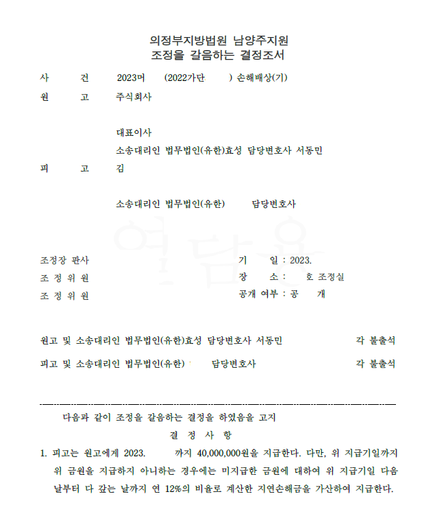 저는 즉각 민사소송 손배청구를 하면서 서약의 존재, 위약금의 액수, 유출행위 등을 구체적으로 주장 입증하였고 법원은 피고가 의뢰인에게 위약금을 지급하는 내용의 강제조정을 하였습니다.