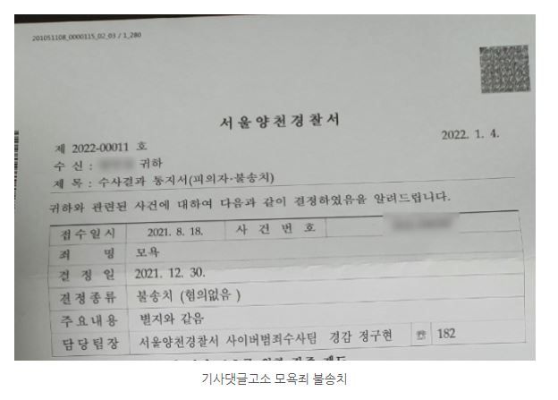 그 결과, 원래 추가조사를 하겠다고 했음에도 연락이 없이 이내 불송치 통지서를 받을 수 있었습니다. 저희의 주장대로 해당 댓글이 고소인을 딱 지칭했다고 볼 수 없다는 이유로 제3자 지칭이 인정되었던 까닭인데요.