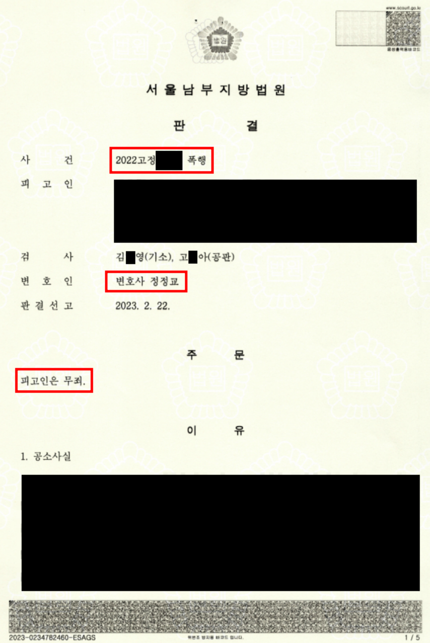 - 결국 법원 역시 변론 내용을 그대로 받아들여, ①CCTV로 폭행 사실 확인하기 어렵고, ②흙먼지 자국도 결정적인 증거로 보기 어려우며, ③피해자 진술의 신빙성도 없다고 판단하였습니다.