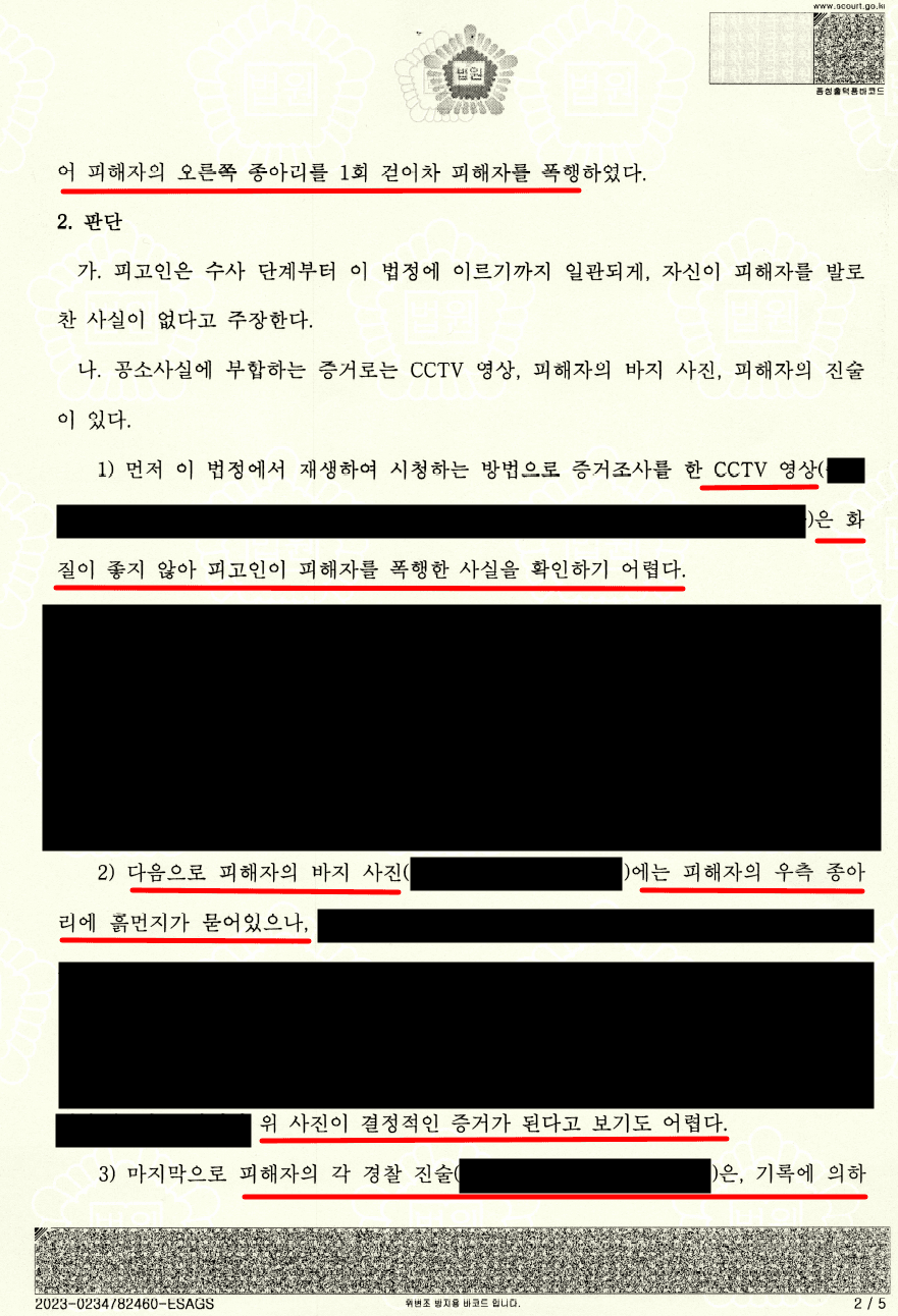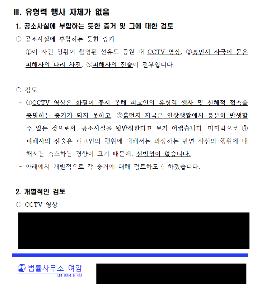 - 즉, ①CCTV 영상에서 의뢰인의 유형력 행사가 명확하지 않고, ②상대방 바지에 묻은 흙자국이 다른 사정들에 의하여 생긴 것으로 보이며, ③피해자의 진술도 허점 투성이였기 때문에 피해자의 진술을 믿기 어렵다는 점을, 논리적으로 변론하였습니다.