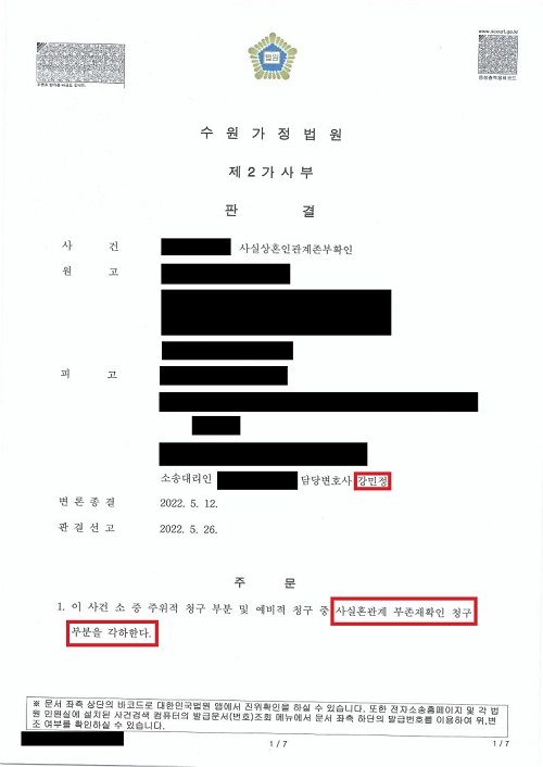 결국, 상대방이 청구한 사실혼관계 부존재확인 청구 부분은 각하 되었으며, 예비적 청구인 사실혼관계 해소에 따른