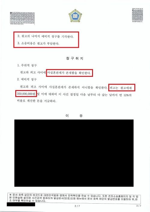 재산분할 3억5천만원 청구 또한 전부기각 되었고, 이에 따른 소송비용까지 모두 상대방이 부담하는 내용의