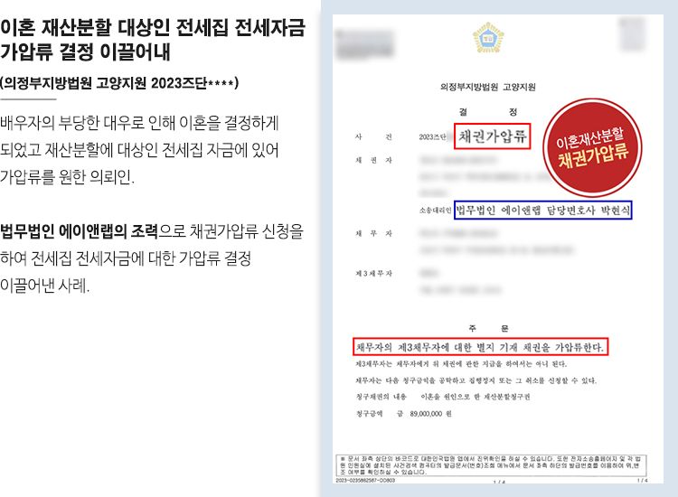 그 결과 의정부지방법원 고양지원으로부터 재산분할 대상인 전세자금 가압류 결정을 이끌어낼 수 있었습니다.