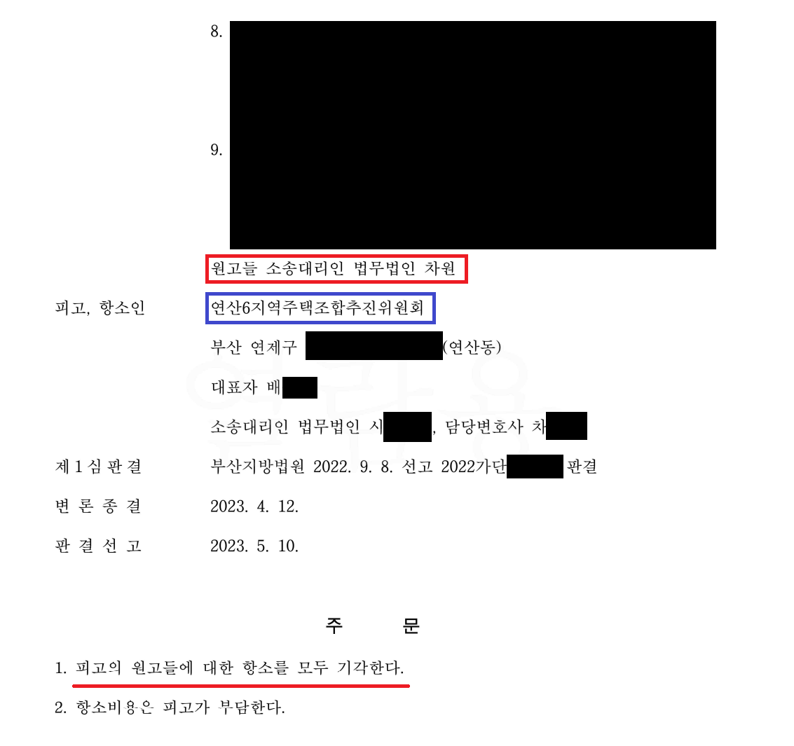 이번에도 재판부는 저의 주장을 받아들여, 제1심에서의 사실인정과 판단은 정당한 것으로 인정됨을 그 이유로하여, 연산6지역주택조합 측의 항소를 기각하였습니다.