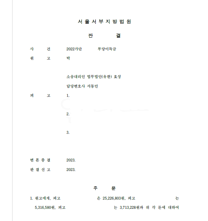 저는 즉각 입금 받은 자들을 피고로 하여 민사소송 부당이득반환청구소송을 제기하였고 법원은 저희의 주장을 받아들여 원고 승소 판결을 선고하여 의뢰인은 피해액을 반환받게 되었습니다.