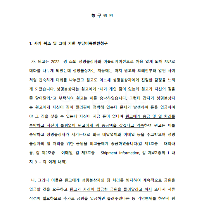 이 사건에서도 의뢰인은 로맨스스캠을 당하여 피고들에게 피해액을 입금하였고 이를 돌려받기 위해 저를 찾아오셨습니다.