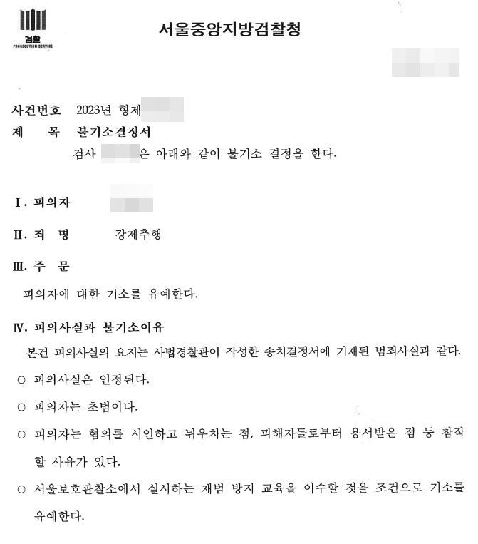 교육이수조건부 기소유예 처분되어 전과 기록에 남지 않게 되었습니다.