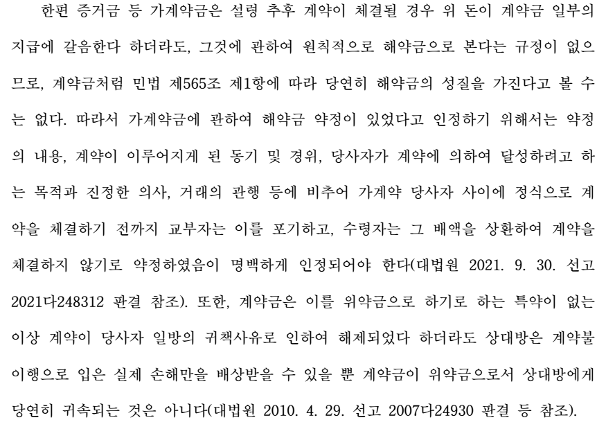 대법원의 판례에 의하면, 가계약금에 대하여 계약금처럼 해약금 약정이 있었다고 인정하기 위해서는 가계약 당사자 사이에 정식으로 계약을 체결하기 전까지 교부자(임차인 또는 매매계약의 매수인)는 이를 포기하고 수령자(임대인 또는 매도인)는 그 배액을 상환하여 계약을 체결하지 않기로 약정하였음이 명백하게 인정되어야 합니다.