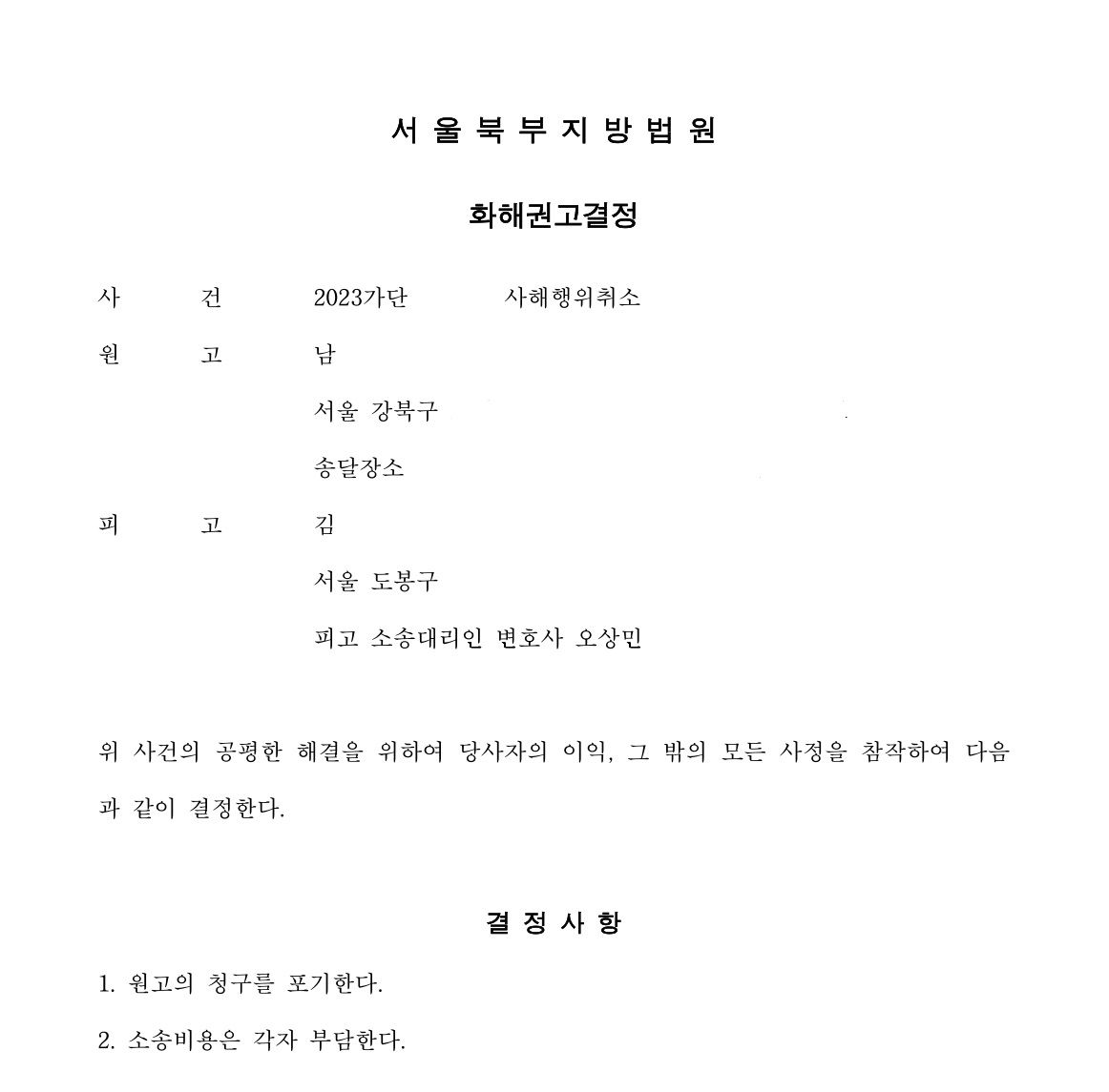 원고는 피고의 답변서를 받아보고 대응에 어려움을 느끼게 되었고, 원고 측에서 먼저 합의를 하자는 제안이 와 원고가 청구를 포기하고 소송비용은 각자 부담하는 조건으로 재판상 화해권고결정을 받았으며 이는 확정되었습니다.
