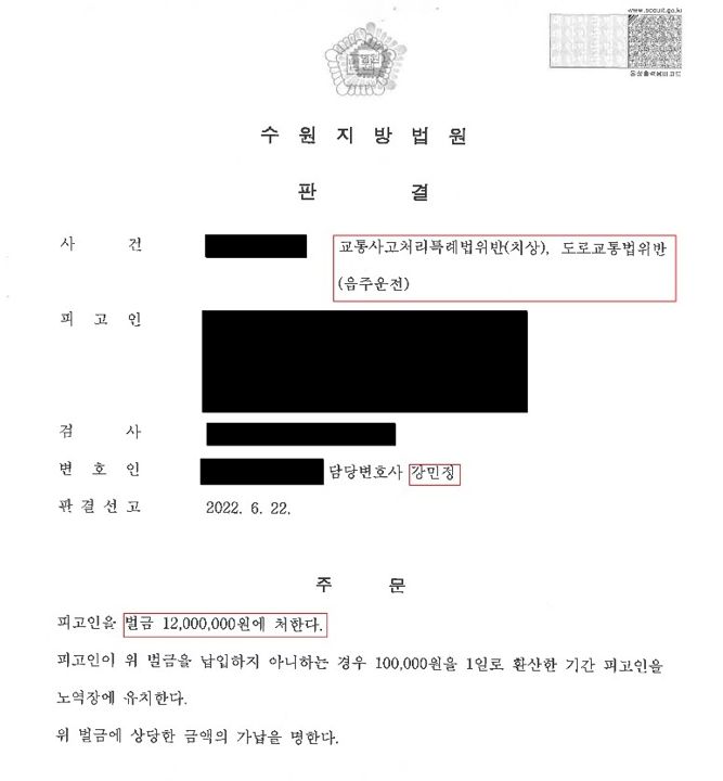 이에 의뢰인은 본인이 저지른 잘못에 괴로워하면서 강민정 변호사를 찾아왔습니다. 음주운전 및 중앙선침범한 위 사건에서 강민정 변호사를 담당변호사로 선임하기로 결정하였습니다.