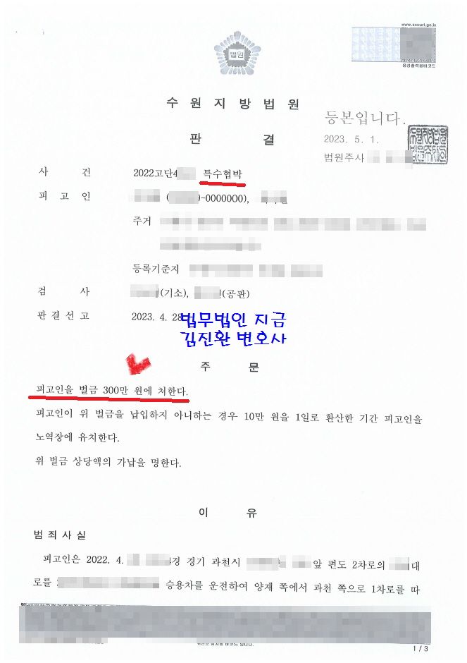 그렇게 해서 판결선고를 며칠 남지 않은 상황에서 합의서가 재판부에 제출되었고 판결선고에서는 예상대로 벌금형이 선고되었으며 판결문 양형이유에서는 피해자와 합의하여 처벌을 원하지 않는 점이 기재되어 있었습니다.