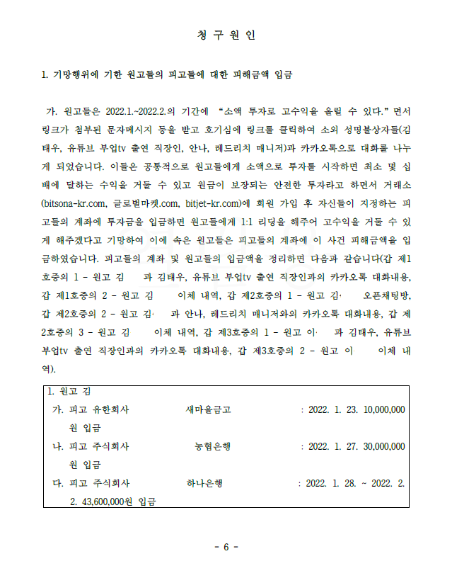 이 사건에서도 의뢰인들은 투자 사기를 당하여 피고들에게 피해액을 입금하였고 이를 돌려받기 위해 저를 찾아오셨습니다.