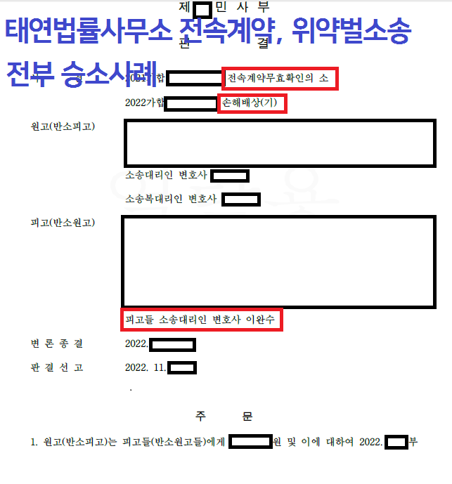 전속계약효력무효확인의 소에서 방어하여 승소하였고, 추가로 상대측에게 위약벌 등 손해배상청구소송을 진행하여 전부 승소한 사례입니다.