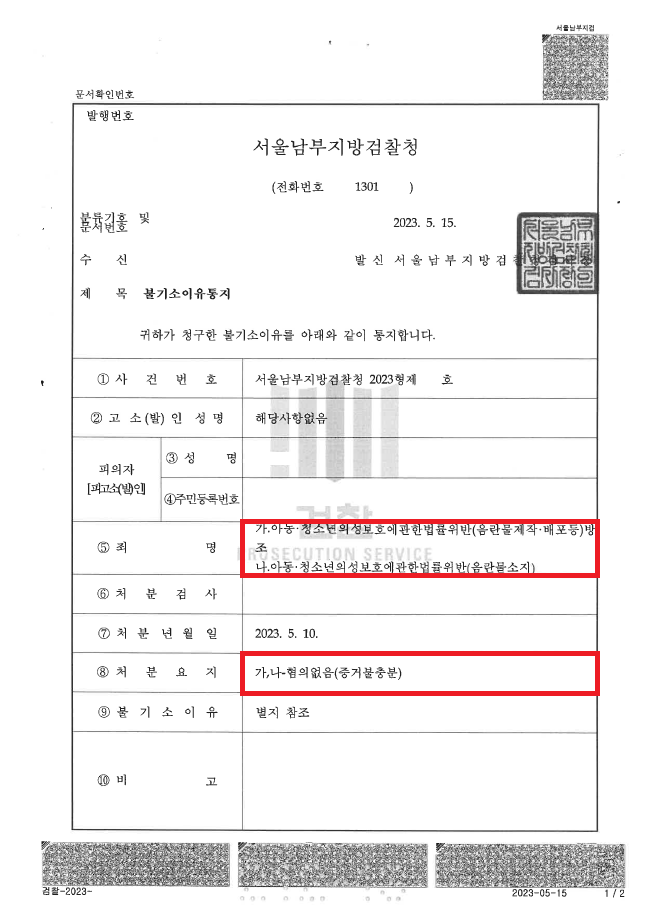 이러한 저의 조력을 바탕으로 A씨는 경찰이 '박사방 방조' 혐의로 입건한 피의자들은 자체적인 수사기법을 통하여 특정한 것으로서 오류 가능성은 거의 없다고 자신하는 상황임에도 불구하고 '혐의없음(증거불충분)' 처분을 받음으로써 억울한 누명에서 벗어날 수 있었습니다.