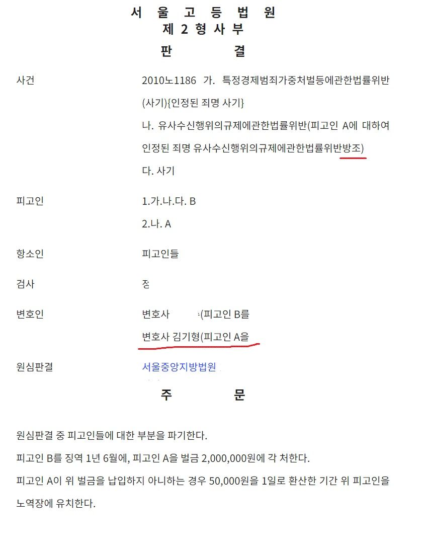 항소심에서 변론을 통해 방조범으로 인정받아 징역형에서 벌금형으로 낮춘 사례