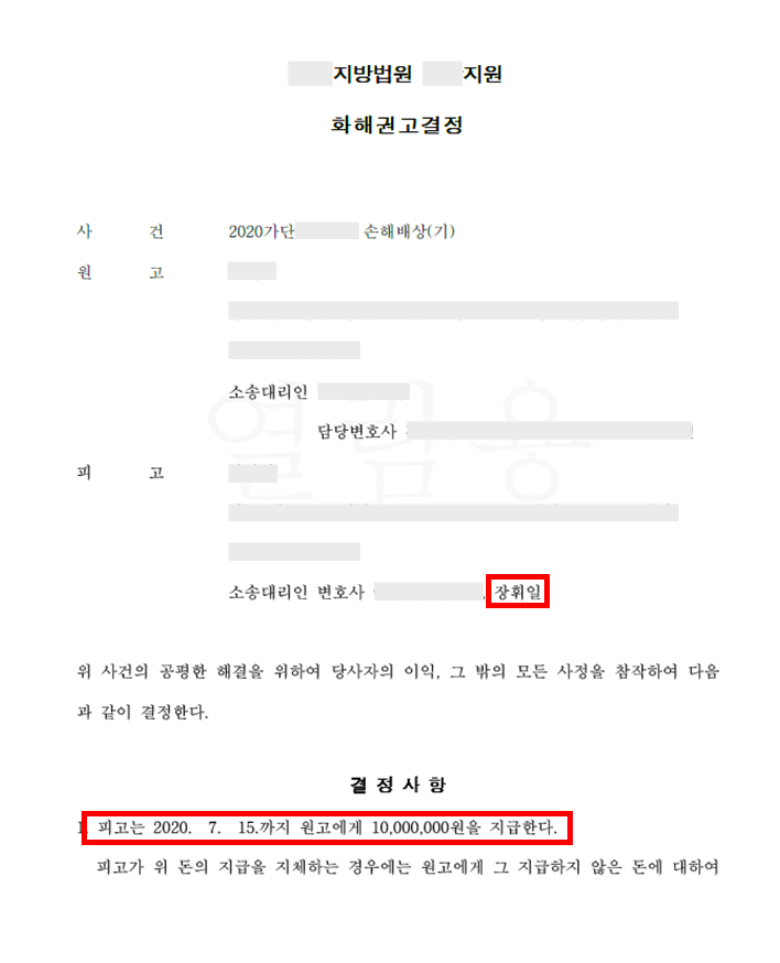 이에 피고는 청구금액 3천만원이 아닌 1천만원을 지급하라는 화해권고 결정문을 받게 되었습니다.