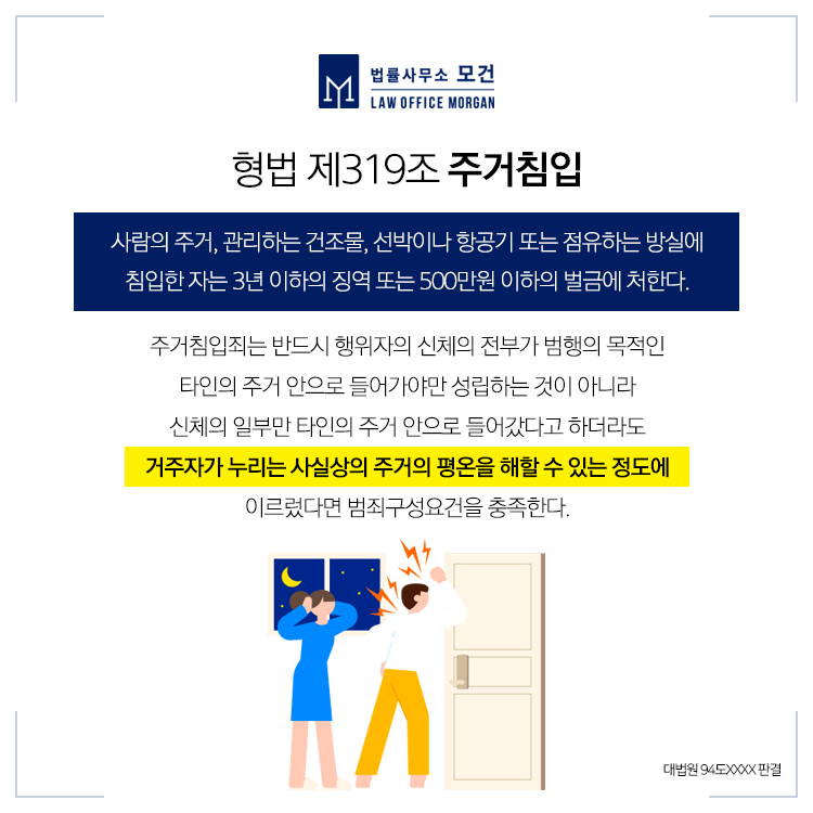 피고인은 몇년 전부터 같은 아파트 아래층에 거주하는 피해자와 층간 소음 문제로 자주 다투어 왔습니다. 피고인은 2019. 1. 오후 3시경 피해자의 거주지 출입문 앞에서 피해자가 고무망치로 벽을 치는 등 층간 소음을 일으킨다는 이유로 수차례 초인종을 누르고 발로 출입문을 걷어차며 고함을 치던 중 피해자의 아들이 귀가하면서 출입문을 여는 사이 오른쪽 발과 다리로 출입문을 막아 닫지 못하게 한 후 현관 입구까지 들어가 피해자의 주거에 침입하였다는 혐의로 기소되어 재판을 받게 되었습니다.