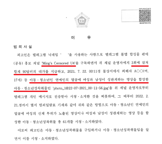 A씨는 2021. 7. 22.경부터 'Ming's Censored U4' 텔레그램 채널에 참여하여 검로드(Gumroad)로 총 3회에 걸쳐 합계 90달러를 구독료로 지급하면서 미성년자 연예인 딥페이크를 시청 및 소지하였습니다.