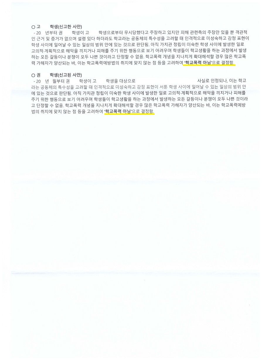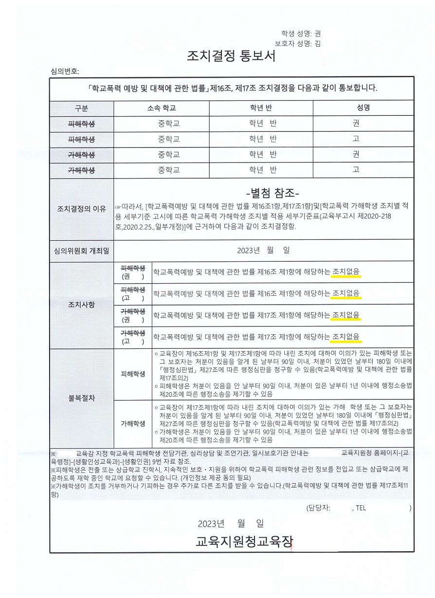 결국, 학교폭력위원회에서 두 사건 모두 “학교폭력 아님”으로 무조치 결정을 받음으로써 성공적으로 마무리가 된 사안입니다.