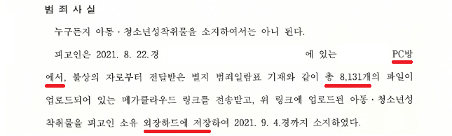 A씨는 2021. 8. 22.경 PC방에서 음란물 사이트에 접속하여 성착취물 총 8,131개를 구매하고 시청한 뒤 외장하드에 옮겨 저장하였습니다.