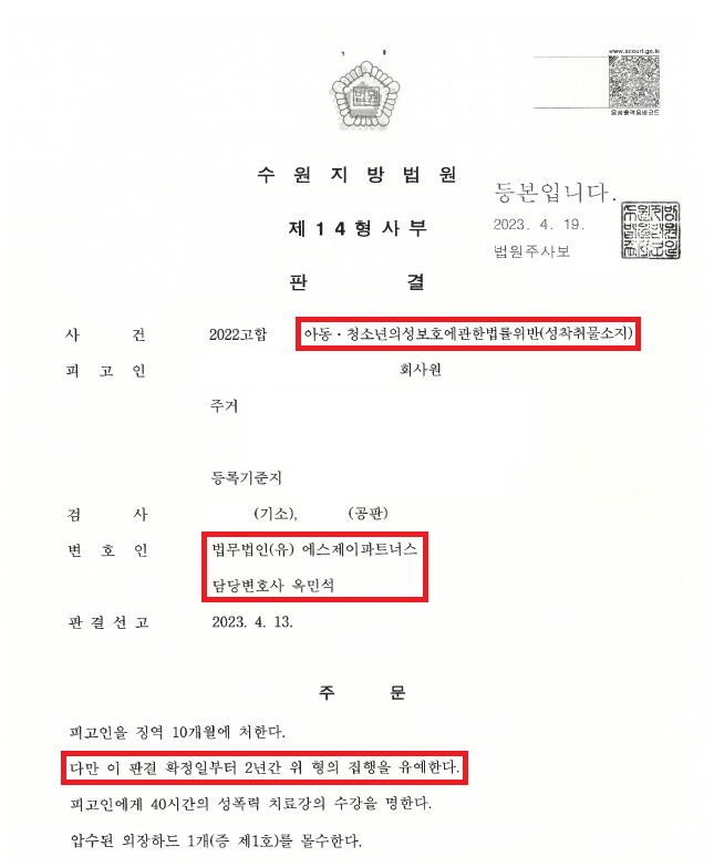 이러한 저의 조력을 바탕으로 A씨는 구매한 성착취물의 개수가 총 8,131개로 매우 많았을 뿐만 아니라 외장하드에 옮겨 저장하였고 특히 구매한 장소도 PC방으로 공개된 장소였음에도 불구하고 집행유예를 선고받음으로써 일생일대의 위기상황에서 벗어날 수 있었습니다.