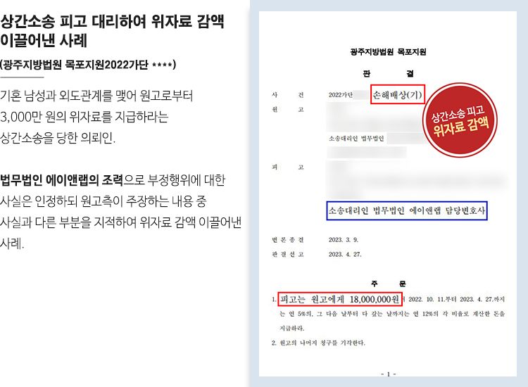그 결과 광주지방법원 목포지원은 이러한 유선경 변호사의 주장을 인정하였고 초기 청구 금액에서 1,200만 원 감액된 금액을 지급하라는 판결을 내렸습니다. 이로써 의뢰인은 과도한 위자료 지급 위기에서 벗어날 수 있게 되었습니다.
