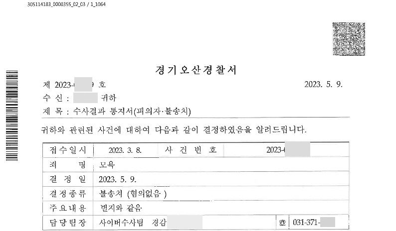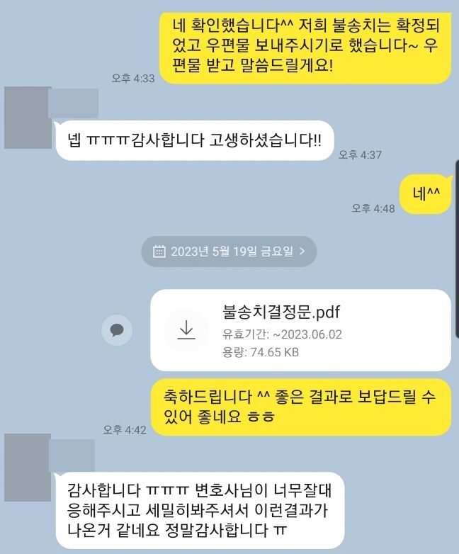 나. 다행스럽게 주장이 받아들여져 '불송치결정(혐의없음)'으로 사건을 종결시켜드렸습니다.