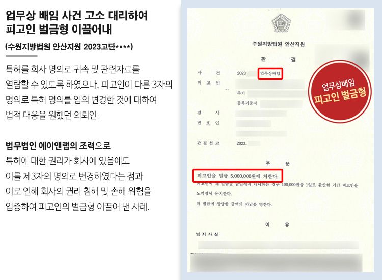이를 토대로 1) 피고는 의뢰인 회사로부터 직무발명금까지 받은 이상 해당 특허에 대한 모든 권리가 회사에 귀속됨이 상당하다는 점, 2) 특허의 권리자 등도 고소인 회사로 바꿔야 할 의무가 있음에도 피고는 자신의 명의에서 제3자의 명의로 특허 권리자를 변경하였다는 점, 3) 피고 스스로 결재 및 급여명세서에 기재된 내역 상당의 비용을 받은 점 등의 사실을 주장하며 해당 행위는 의뢰인 회사의 권리 실현을 불가능하게 하는 손해의 위험을 초래한 것으로서 업무상배임죄에 해당함을 적극 주장하였습니다.