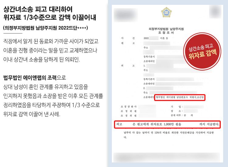 법무법인 에이앤랩의 타당한 주장으로 사건을 담당한 의정부지방법원 남양주지원에서는 청구 당한 위자료의 1/3 수준인 1천만 원을 지급하라는 조정을 내려주었습니다. 해당 사례는 과도한 위자료를 청구 받았지만 신속하게 변호사를 찾아 받은 치밀한 조력으로 위기에서 벗어날 수 있었던 사례입니다.