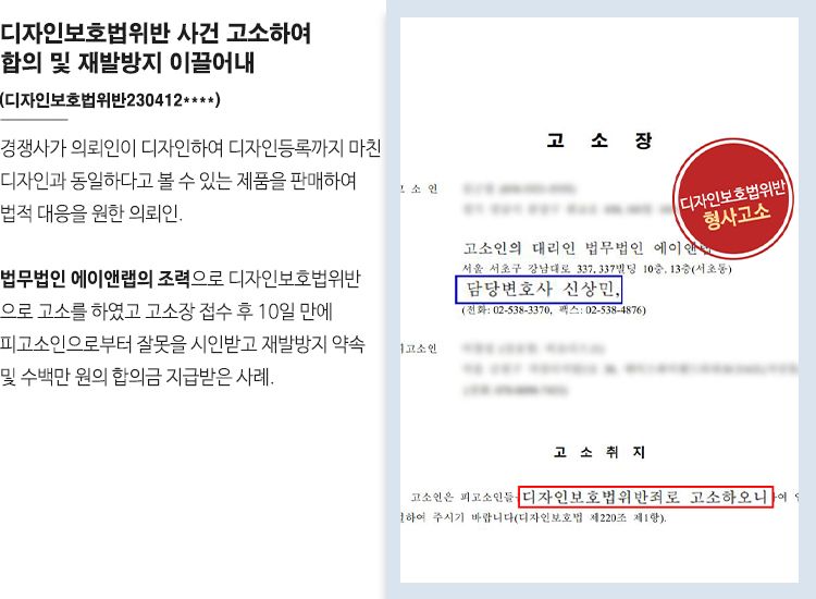 우리 의뢰인(고소인)은 운동복 디자인에 관하여 특허청에 디자인등록을 마친 디자인권자입니다. 하지만 경쟁사에서 의뢰인의 디자인과 동일하다고 볼 수 있는 디자인의 제품을 제조하여 판매하는 것을 확인하였고 이에 법적 대응을 위해 저희 법무법인 에이앤랩을 찾아오셨습니다.